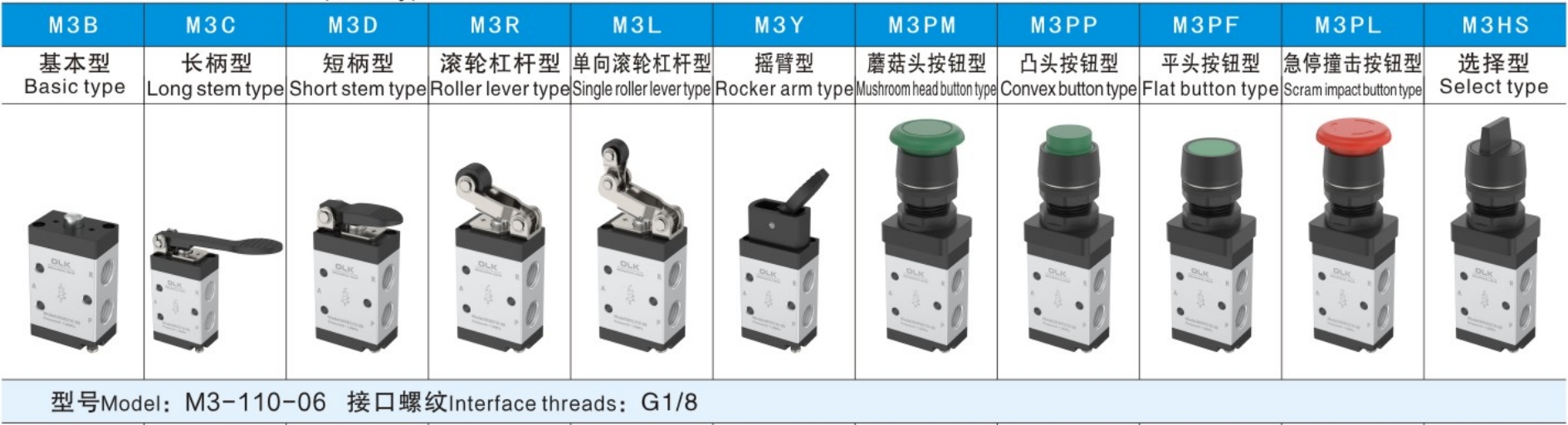 รหัสการสั่งซื้อ ม3 น 210 06 R ชุด ประเภทปุ่ม รหัส ขนาดพอร์ต สีของปุ่ม M3:Mseries 2 ตำแหน่ง 3 ทาง B:ประเภทพื้นฐาน (M3B) การควบคุมเดี่ยวซีรีส์ 110:110 100:06:G1/8 พีแอล:สีแดง C:แบบด้ามยาว (M3C) การควบคุมเดี่ยวซีรีส์ 210:210 200:06:G1/8 PP/PF/PM/HS:สีแดง สีเขียว สีดำ D:แบบด้ามจับสั้น (M3D) 200:08:G1/4 R:แบบก้านโยกโรเลอร์ (M3R) L:ประเภทก้านโยก โรเลอร์ ทิศทางเดียว (M3L) Y:แบบแขนโยก (M3Y) PM:แบบกระดุมหัวเห็ด (M3PM) PP:แบบปุ่มหัวยก (M3PP) PF:ประเภทปุ่มหัวแบน (M3PF) PL:ปุ่มหยุดฉุกเฉินแบบกระแทก (M3PL) HS:ประเภทตัวเลือก (M3HS)