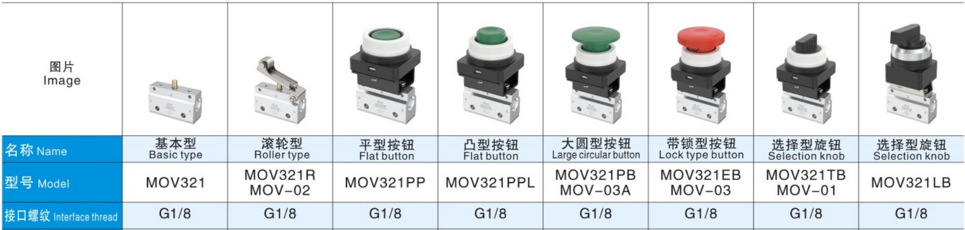 วาล์วซีรีย์ MOV321 สามารถควบคุมกระบอกสูบแบบออกทางเดียวที่มีเส้นผ่านศูนย์กลางส่วนต่อประสาน M5 และ G1/8 P หมายถึงทางเข้า A หมายถึงทางออก และพอร์ตไอเสียอยู่ที่ก้านกระทุ้ง