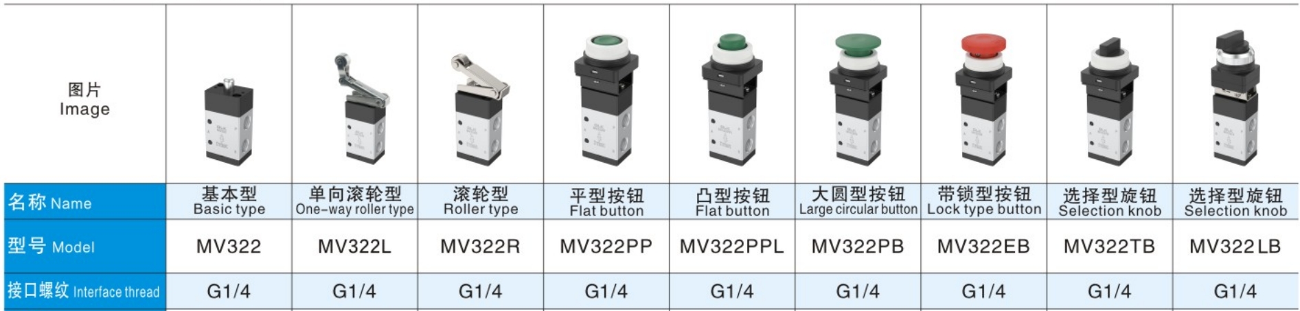 เอ็มวี 32 2 R แบบอย่าง: ตำแหน่งที่: ขนาดพอร์ต: ประเภทปุ่ม: เอ็มวีแมคคานิคอลวาล์ว ตำแหน่ง 32:2 3 ทิศทาง 2:G1/4 ว่างเปล่า: ประเภทพื้นฐาน (MV322) R:ประเภทลูกกลิ้ง (MV322) PP:กระดุมแบน (MV322PP) PPL:ปุ่มนูน (MV322PPL) PB:ปุ่มวงกลมขนาดใหญ่ (MV322PB) FB:แบบล็อคได้ (MV322EB) TB:ประเภทปุ่มตัวเลือก (MV322TB) LB:แบบลูกบิดเลือกค่า (MV322LB)