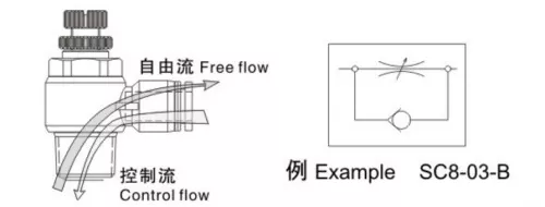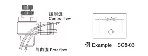 จากสัญลักษณ์การทำงานเราจะเห็นได้ว่าวาล์วควบคุมการไหลไอเสียและทางเข้าเป็นวาล์วปีกผีเสื้อทางเดียวควบคุมการไหลในทิศทางเดียวเท่านั้นโดยปล่อยให้ลมย้อนกลับไหลผ่านได้อย่างอิสระ สำหรับกระบอกสูบแบบดับเบิ้ลแอคชั่น แนะนำให้ใช้วาล์วปีกผีเสื้อไอเสียเพื่อปรับปรุงเสถียรภาพการเคลื่อนที่ของกระบอกสูบ สำหรับกระบอกสูบแบบออกทางเดียว ซึ่งโดยปกติจะใช้สปริงเพื่อขยายหรือถอยกลับเมื่อไม่มีอากาศจ่าย ก๊าซจะต้องเอาชนะแรงสปริงในระหว่างการใช้งาน ดังนั้นวาล์วปีกผีเสื้อทางเข้าจึงเหมาะสำหรับการควบคุมความเร็ว