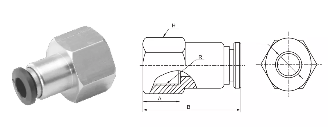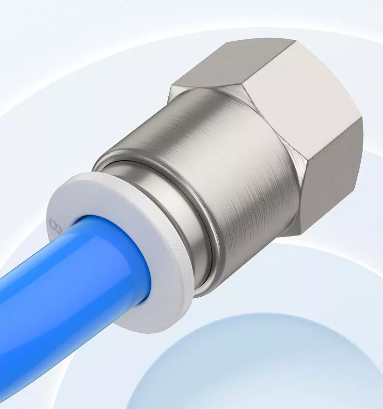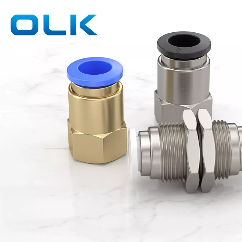PCF ตัวเมียแบบตรงในหลอดที่เหมาะสมและด้าย PC ตัวผู้กดตรงในหลอดที่ติดตั้งทั้งหมดเป็นของประเภทพื้นฐาน push-in-fitting แต่ PCF เป็นเธรด R ตัวเมียตรงด้ายภายในใช้เพื่อเชื่อมต่อส่วนประกอบเกลียวภายนอก สั้นลงและติดตั้งอย่างกะทัดรัดมากขึ้น