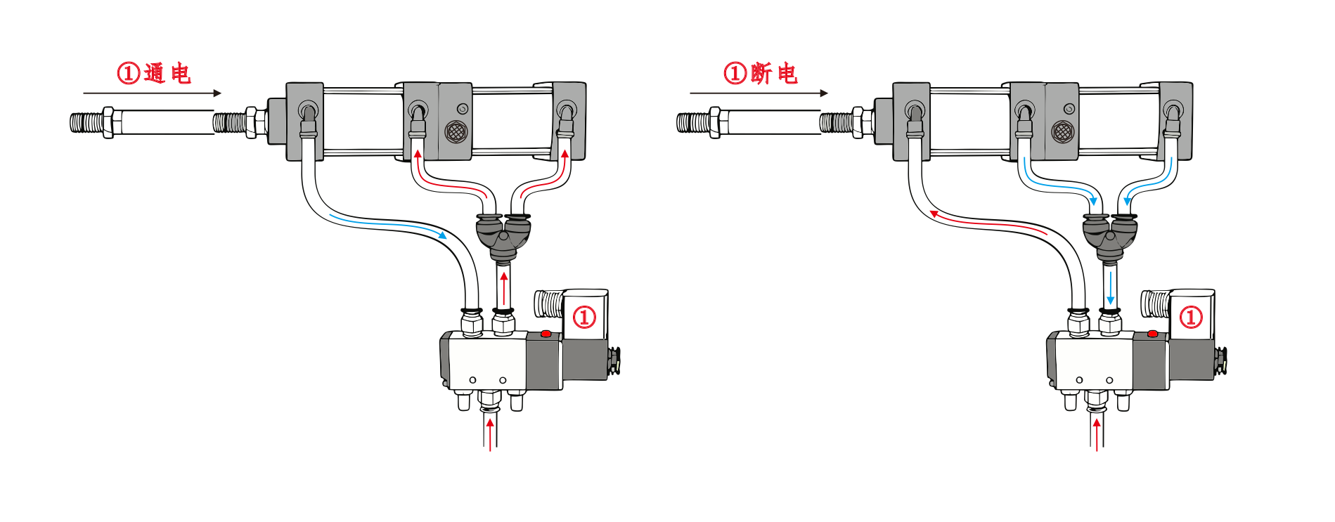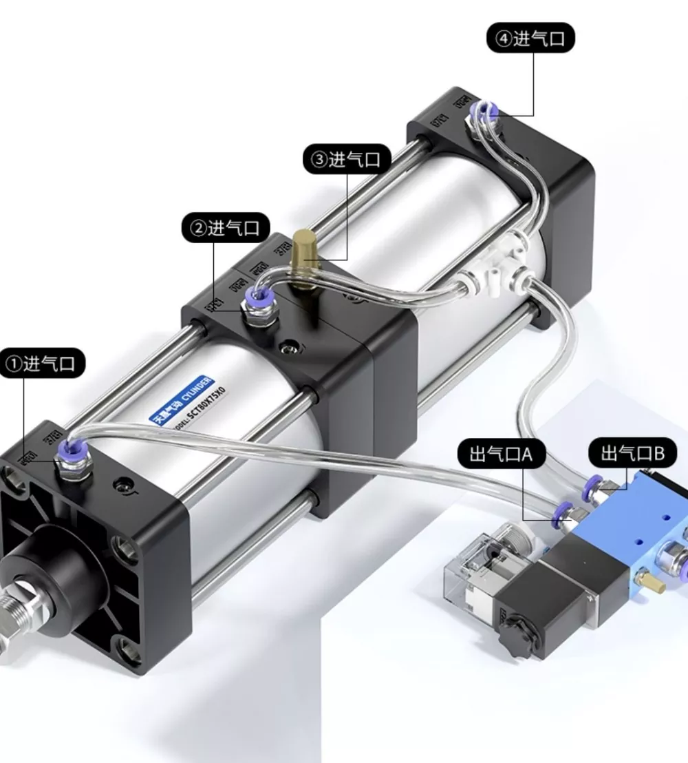 ช่องอากาศเข้าของกระบอกสูบ ④ เชื่อมต่อกับพอร์ต A ของโซลินอยด์วาล์ว และช่องอากาศเข้าของกระบอกสูบ ④ เชื่อมต่อแบบอนุกรมกับพอร์ต B ของโซลินอยด์วาล์ว ช่องอากาศเข้าของกระบอกสูบ 3 เชื่อมต่อกับตัวเก็บเสียง เมื่อพอร์ต A ของโซลินอยด์วาล์วเปิดอยู่ กระบอกสูบจะยังคงอยู่ในตำแหน่งหดกลับ เมื่อพอร์ต B ได้รับพลังงาน กระบอกสูบจะเริ่มทำงาน