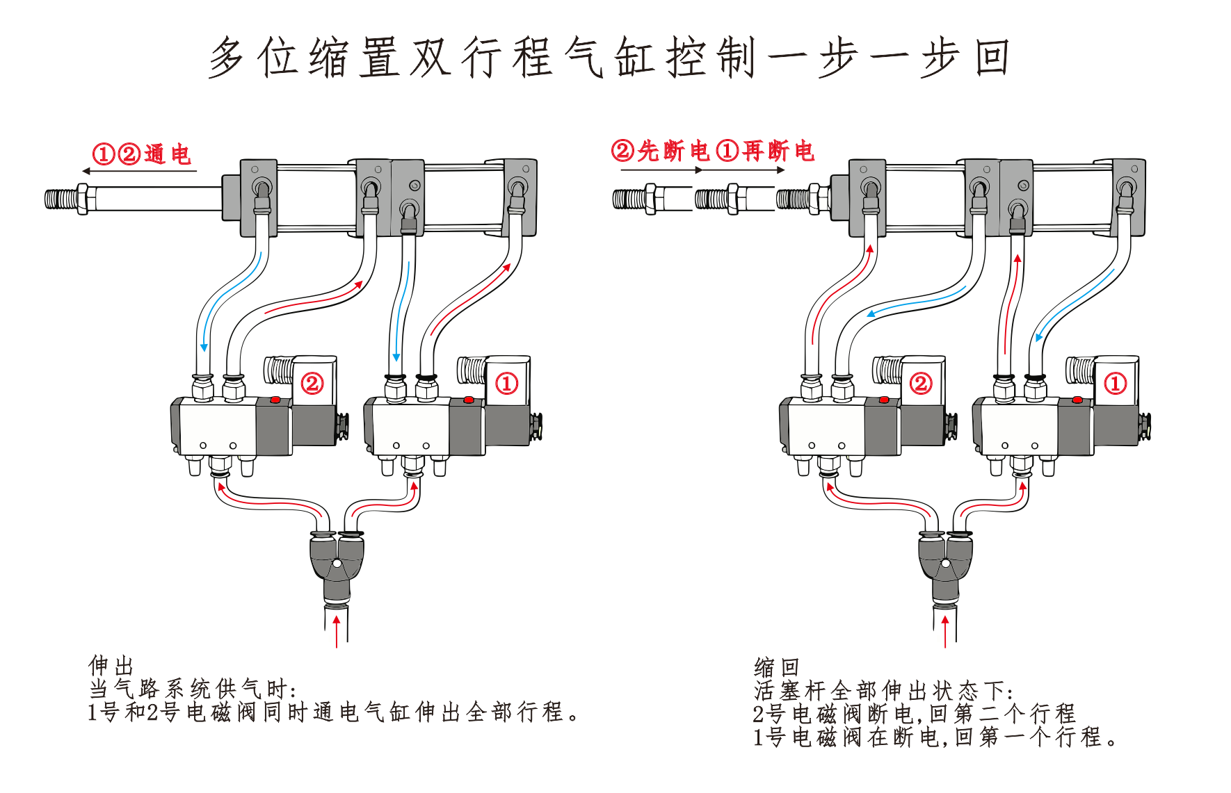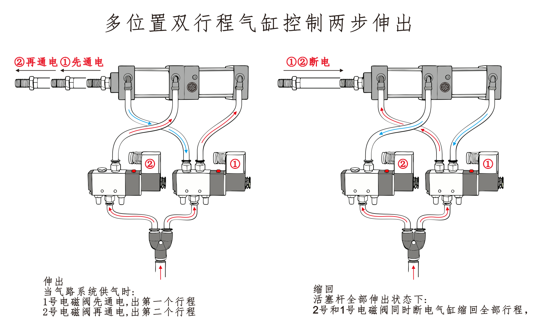 จากนั้นโซลินอยด์วาล์วหมายเลข 2 จะถูกกระตุ้น และกระบอกสูบจะขยายไปจนถึงจังหวะที่สอง