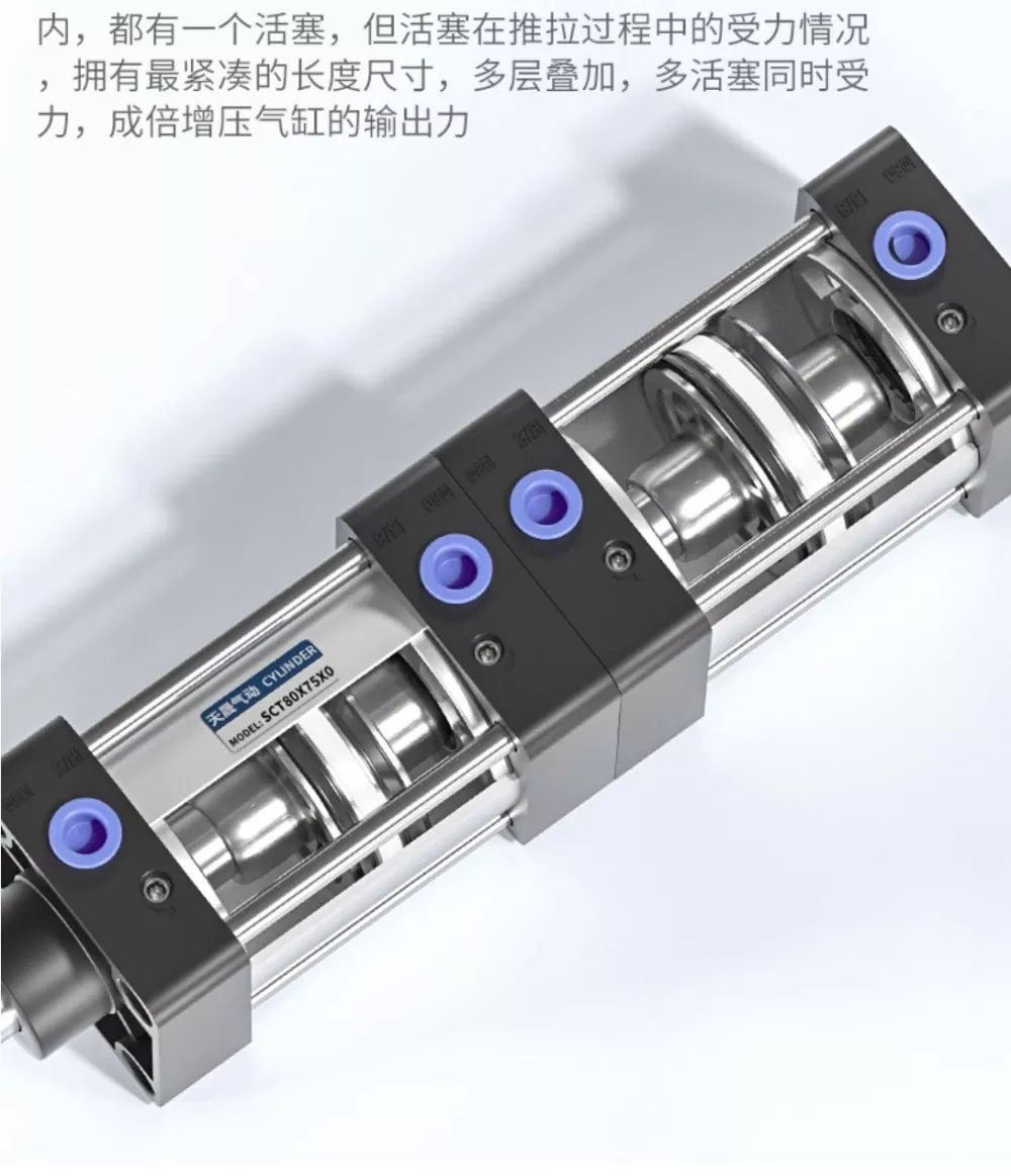 กระบอกสูบคันบังคับ SCT มีวงแหวนซีล YCC สองทิศทางและการออกแบบจังหวะสองจังหวะอันทรงพลัง พร้อมรูปลักษณ์ที่กะทัดรัดและประณีตซึ่งรับประกันการทำงานที่รวดเร็วและเอาต์พุตที่ราบรื่นและมีเสถียรภาพ แต่ละชั้นของกระบอกสูบประกอบด้วยลูกสูบแต่ละตัว และในระหว่างกระบวนการผลัก-ดึง ลูกสูบหลายตัวจะแบ่งรับน้ำหนัก ทำให้กระบอกสูบมีความยาวที่กะทัดรัดที่สุด ในขณะเดียวกันก็สร้างแรงเอาท์พุตแบบทวีคูณผ่านโครงสร้างที่ซ้อนกันหลายชั้น การออกแบบแรงสองเท่านี้ให้กำลังที่แข็งแกร่งขึ้น และการกำหนดค่าวงแหวนซีลหกวงให้ประสิทธิภาพการซีลที่ยอดเยี่ยม ทำให้กระบอกสูบสามารถเก็บแรงดันได้สูงถึง 1.4 MPa โดยไม่มีการรั่วไหล